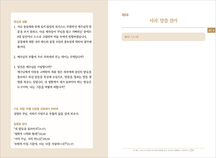 각 과는 '읽기' '배움' '묵상과 생활' '일용할 양식' '기도 지향'으로 짜여 있다.