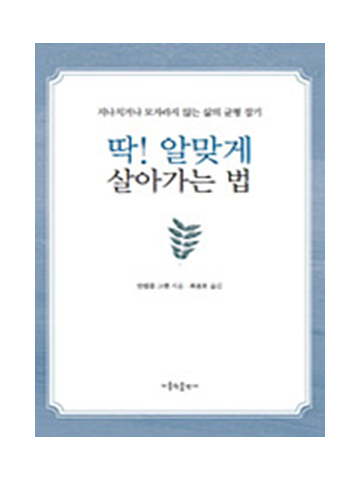 가톨릭출판사(사장 홍성학 아우구스티노 신부)에서 나온 《딱! 알맞게 살아가는 법》은 우리가 일상에서 받는 스트레스를 본질적으로 해결해 주는 방법을 구체적으로 알려 주는 책이다. ‘가톨릭 대표 영성가’이자 ‘영성 심리 상담의 대가’로 불리는 안셀름 그륀 신부는 자신의 여러 가지 경험을 통해 중용을 찾고 자신 안에 있는 치유자를 찾는 방법을 알려 준다. 이는 우리가 고요하고 여유 있는 마음을 지니고 평온을 누릴 수 있는 방법이기도 하다.